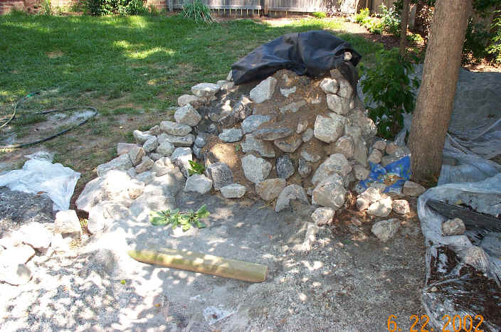 Everything was sliding, so I poured quick crete under the pond liner at the waterfall and placed landscape timbers under the slate. |