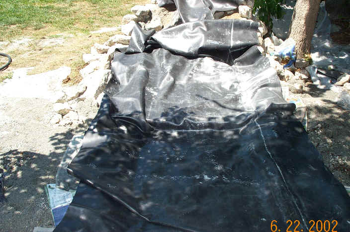 | Liner is 5' wide x 15' long. It will reach half way up the waterfall. The waterfall has a 6'x8' liner. I will tuck the creek liner under the waterfall liner at half way point. There is about a 2' over lap. |