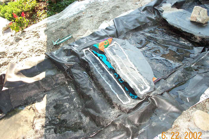 I put a generous amount of silicon on my slate to hold it in place. This will go on top over the landscape timber were placed.